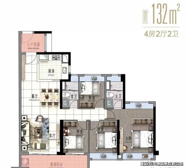 建面140平四房两卫,LDK一体化设计,主卧270度景观飘窗,客厅进深6米,