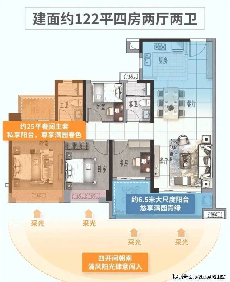 建面122平四房两卫,L型阳台约6.5米,LDK一体化,四开间朝南