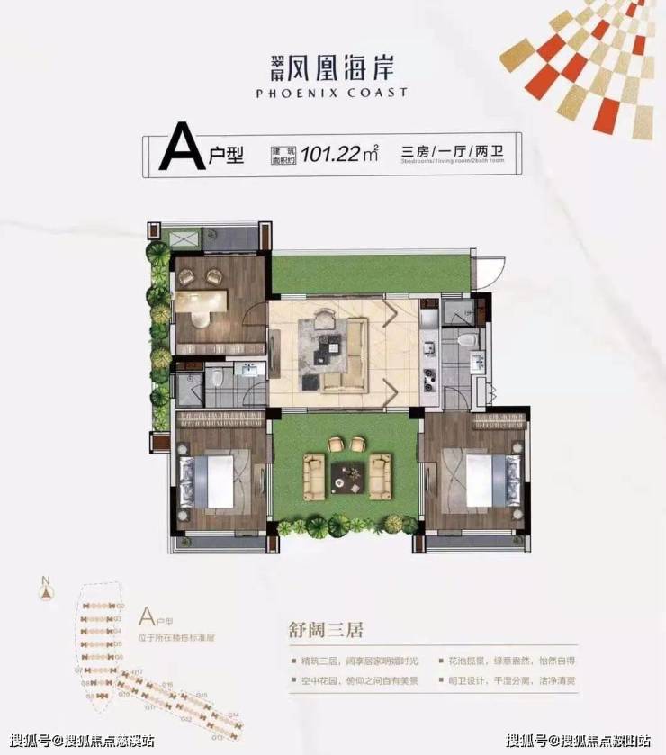 在售产品:A/B户型(标准层),面积约101㎡三房两厅两卫