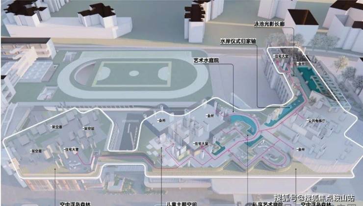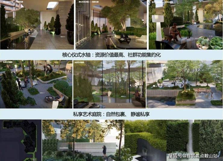 项目利用裙房屋顶打造拥有“仪式水轴“艺术庭院”“空中浮岛森林”三级景观设计的空中庭院,四栋住宅均漂浮于甲板之上,独享甲板庭院花园,以“海风吹拂下的豪宅底盘”托举城市上空的豪宅群落,形成立体景观系统。