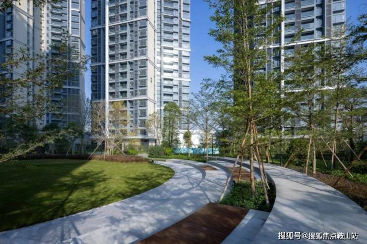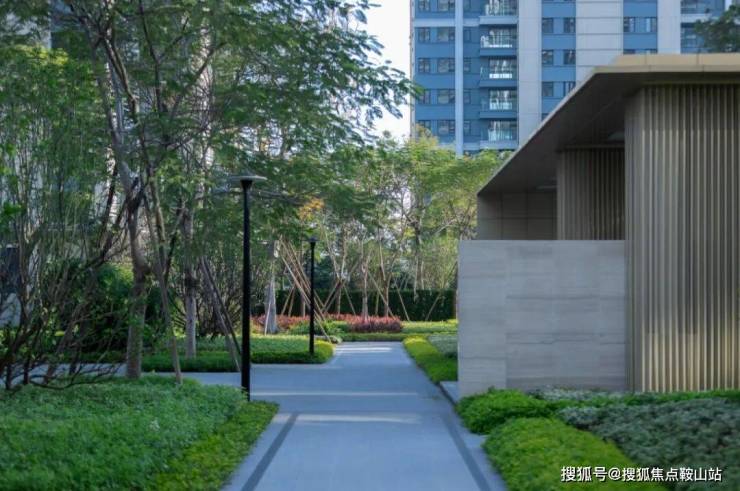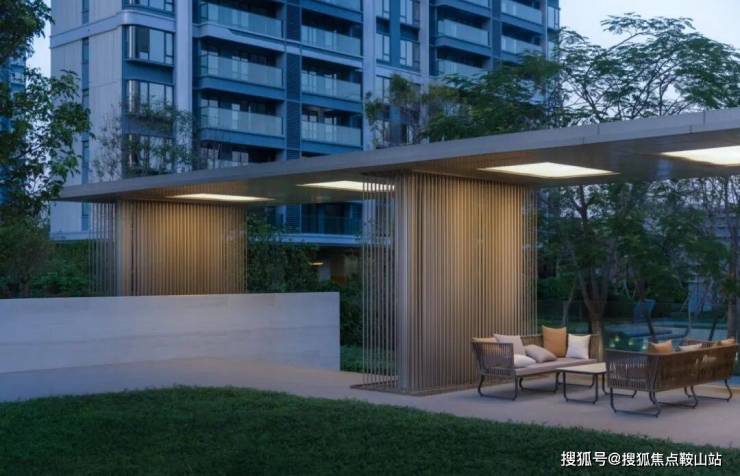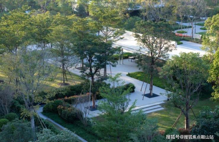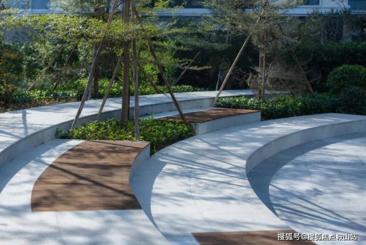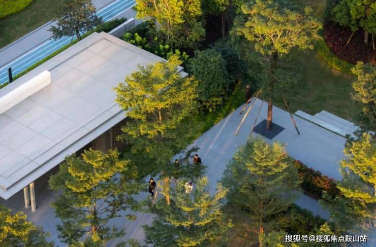 設計利用地形起伏,圍繞景觀水景建起涵蓋林下休閑、戶外會客、陽光草坪等多元化功能的城市客廳,結合節點處的蔥蘢綠植和隨時間更叠的光影變化,構築趨向於自然演繹的院落式生態場景。