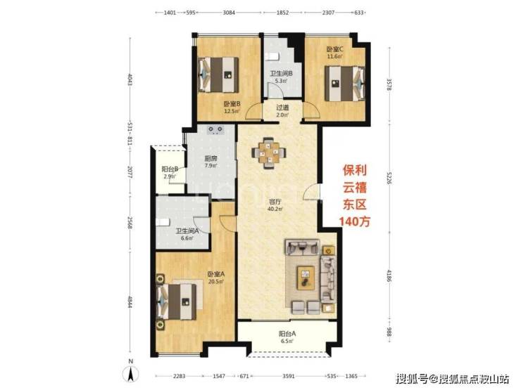 先看云港城这个140方户型很明显就是对标保利云禧东区的140方。