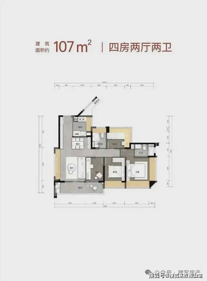 107㎡的4房2厅2卫,设计的是经典竖厅格局,客厅4米开间,LDKB一体化,S墙设计预留冰箱卡槽位,动静分区,分别做到了主卧17.18㎡/次卧11.2㎡/次卧8.64m²/次卧7.68㎡(包含墙体飘窗),U型厨房,卫生间干湿分离,得房率约79.6%(不含赠送),客厅连接次卧出10.24m²观景大阳台,东南朝向。套内面积85.19m²+赠送面积22.96m²=实用面积108.15m²,加上赠送面积后得房率101.08%。