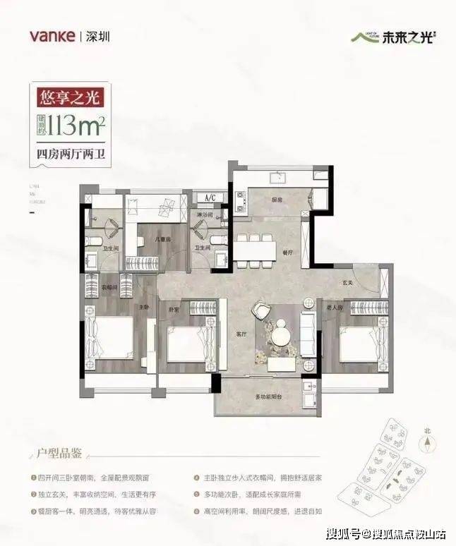 建面约113的四房两厅两卫户型:设计足以让改善客眼前一亮,LDK餐厨空间的设计更具开放性,让客厅、餐厅、厨房、阳台一体化,空间得以延伸,家人间的互动也更加紧密。同时四个房间的设计,无论是多胎家庭还是三代同堂的需求都能很好地满足。