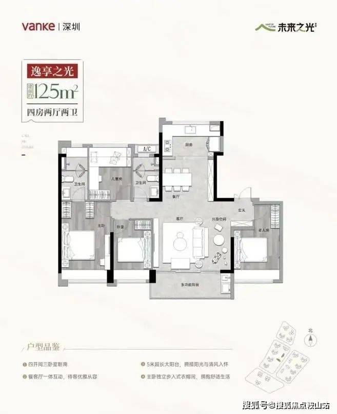 建面约125的四房两厅两卫户型:设计足以让改善客眼前一亮,LDK餐厨空间的设计更具开放性,让客厅、餐厅、厨房、阳台一体化,空间得以延伸,家人间的互动也更加紧密。同时四个房间的设计,无论是多胎家庭还是三代同堂的需求都能很好地满足。