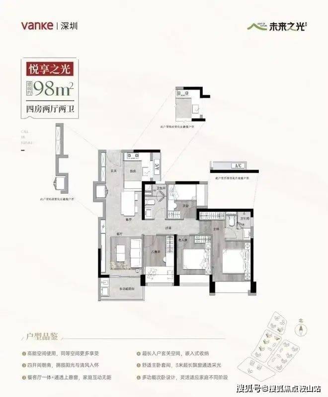 建面约98㎡的四房两厅两卫户型:同样是主卧、次卧、阳台连片的大面宽全景设计,整体通风采光效果极佳。