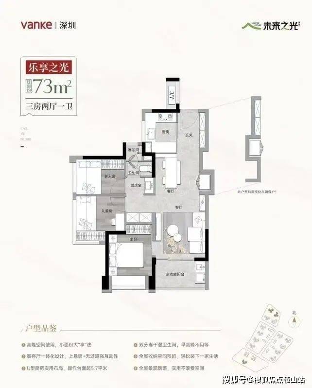 建面约73㎡的三房两厅一卫户型,这个户型是今年深圳西部中3房面积最小的,在满足一家人基本空间需求的同事,产品总价也被很好地被控制在一定范围内。