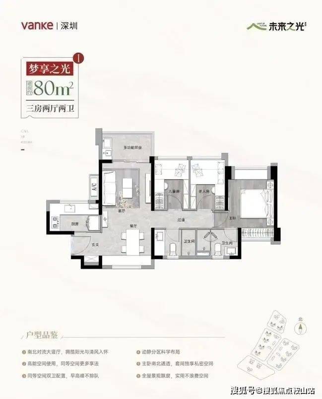 建面约80㎡的三房两厅两卫的产品:在控制面积的同时做到设计有主套和客卫,放眼整个深圳西部都很难找到类似的产品。这个面积段的产品共有A、B两种户型可以选择。