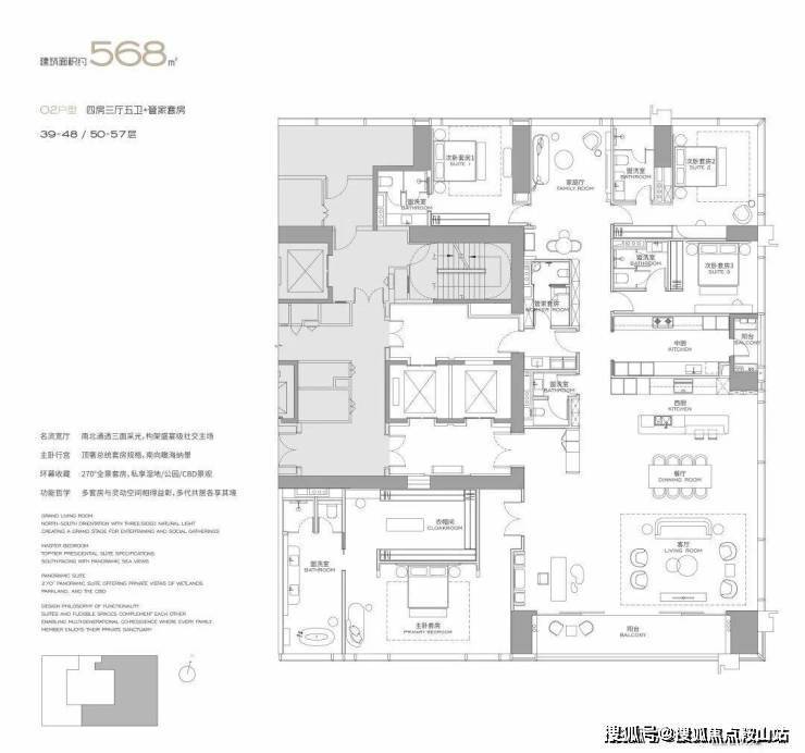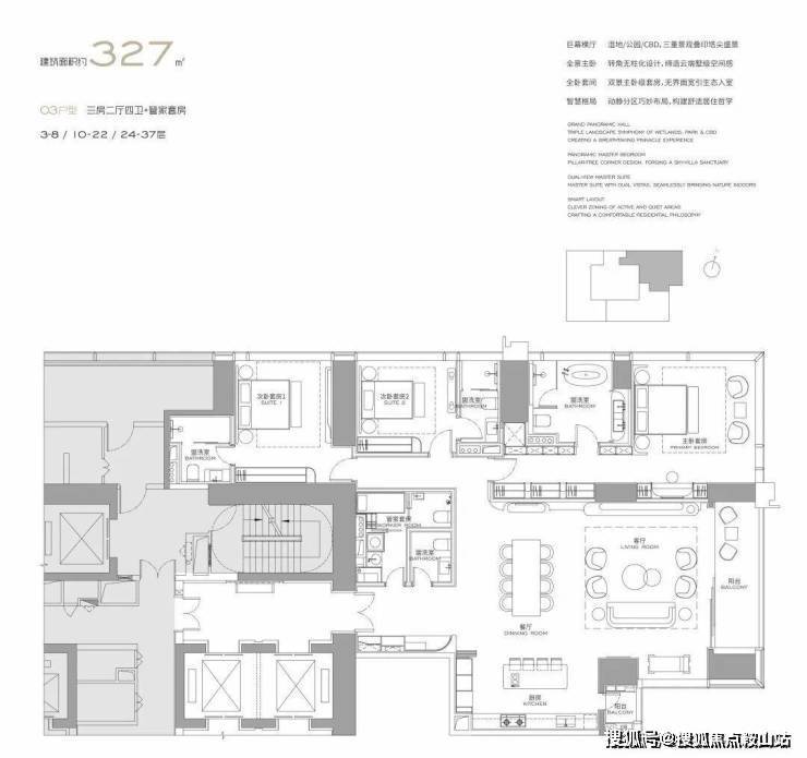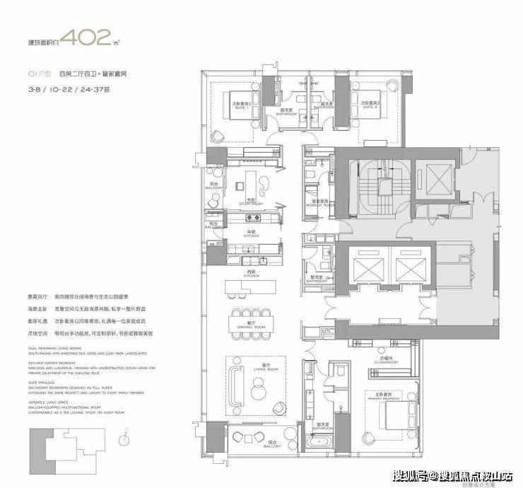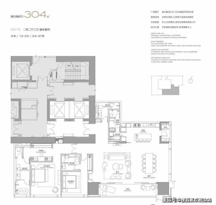 首推T3栋304-327-402-570-1032㎡,304㎡做了两房三卫+家政套间,327㎡做了三房四卫+家政套间,402㎡做了四房四卫+家政套间,570㎡做了4+1房五卫+家庭厅+家政套间。