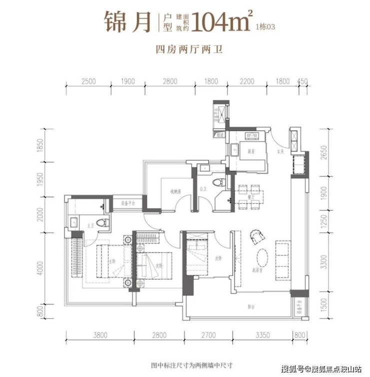 双龙抱珠设计,客厅面宽3.7米,四开间朝南,主卧和两个次卧有转角飘窗。得房率约104.06%(含赠送),客厅连接约11.76㎡超大阳台,朝向东北。