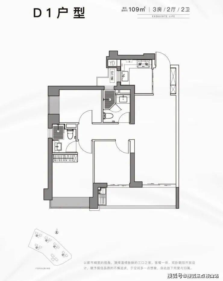 109㎡的3房2厅2卫,设计的是竖厅格局,餐客厅一体化,动静分区,三开间朝南,L型厨房,得房率:70.53%(不含赠送),客厅连接卧室出大阳台,西南朝向。