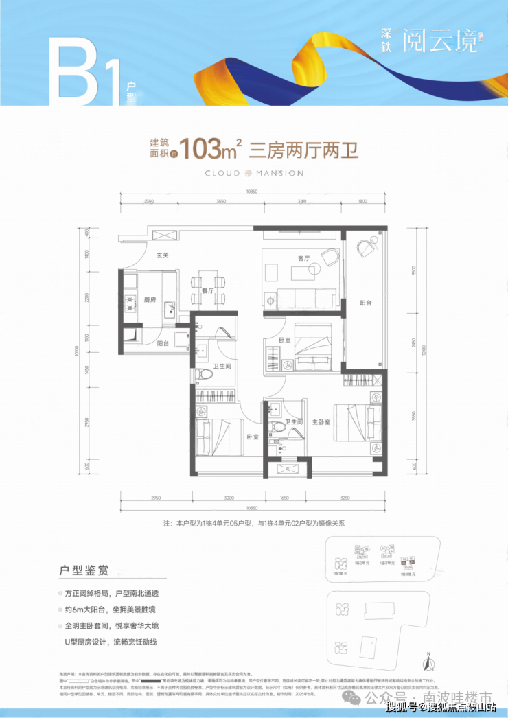 103㎡的3房2厅2卫,B1-1栋4单元02.05户型,设计的是经典竖厅格局,进门入户玄关,客厅3.5米开间,LDKB一体化,S墙设计预留冰箱卡槽位,三开间朝南,动静分区,3个卧室分别做到了主卧15.13㎡/次卧10.05/次卧7.71㎡(包含墙体飘窗),二字型厨房带1个3.24㎡大的生活阳台,卫生间干湿分离,得房率79.2%(不含赠送),客厅连接次卧出10.71㎡大阳台,正西或正东朝向。套内面积81.58㎡+赠送面积10.72㎡=实际使用面积92.3㎡,加上赠送后得房率约89.61%。