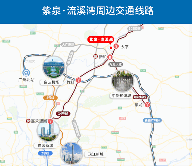 紫泉·流溪湾位居TOD太平站旁,项目交通网路通达,华南快速、机场高速、新广从快速(在建)、北部快线(在建)环绕;105国道、118省道,地铁14号线在侧,无缝接驳广州城央、各大区中心,珠三角城市群。