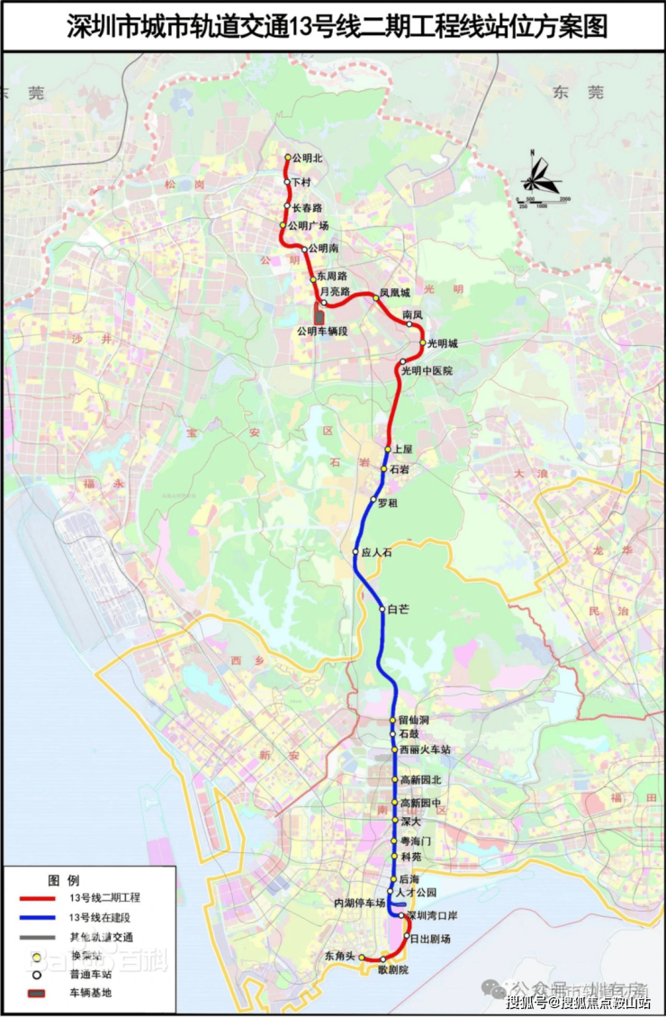 ①13号线及其南、北延长线(建设中,预计2025年开通)起于东角头站,终于公明北站,纵贯光明、宝安、南山,线路开通后约30分钟可抵达南山核心区,约45分钟可达深圳湾口岸,以高新技术人才为主要客流,被称为高新技术人才专线