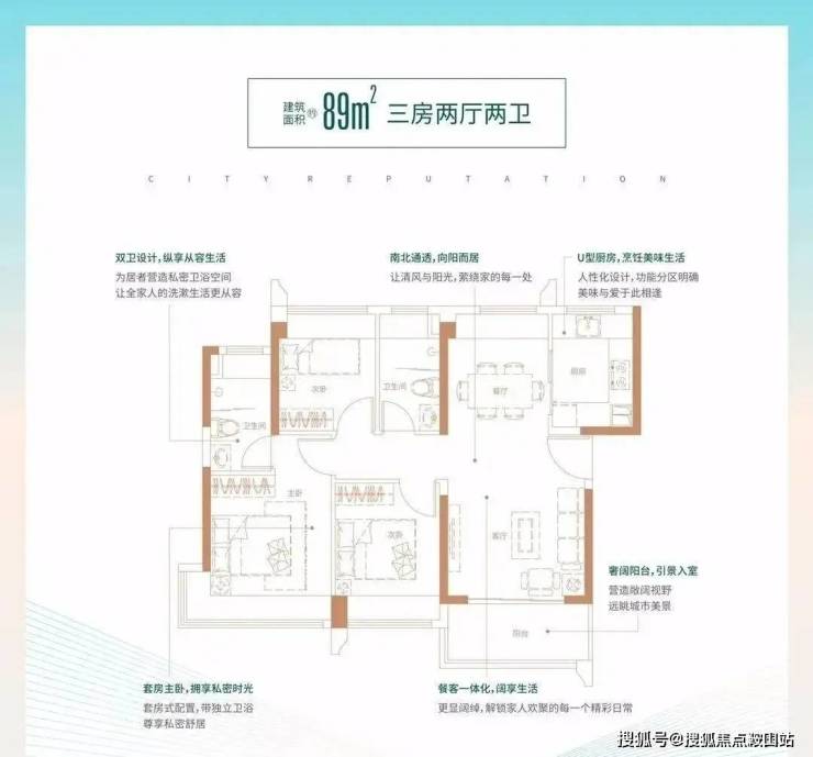 89㎡的3房2厅2卫:有2个户型,1个设计的经典竖厅格局,有西南及东南朝向;1个设计的竖厅南北通透格局,U型厨房。