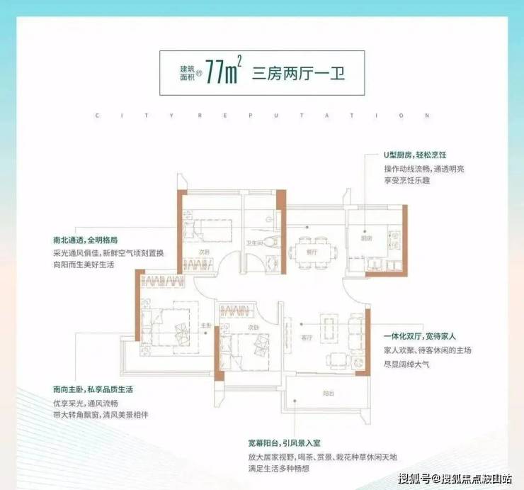 77㎡的3房2厅1卫:设计的竖厅南北透格局,U型厨房,仅有1/2栋04户型才有