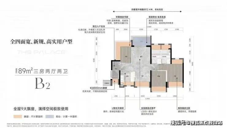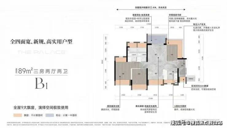 首推一期1栋1单元,面积约89-112㎡ 3-4房,主力产品为89㎡3房,其A1户型为常规经典竖厅,但是在客厅位置多了一个长飘窗,且每个户型都有270度大飘窗。