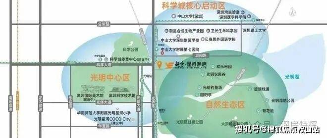 :西北侧与科学公园北翼相邻,东南侧是光明欢乐田园,北侧靠近中山大学深圳校区及其附属第七医院,南面距离光明高铁站仅4.8公里,周边自然景观丰富,居住环境舒适。