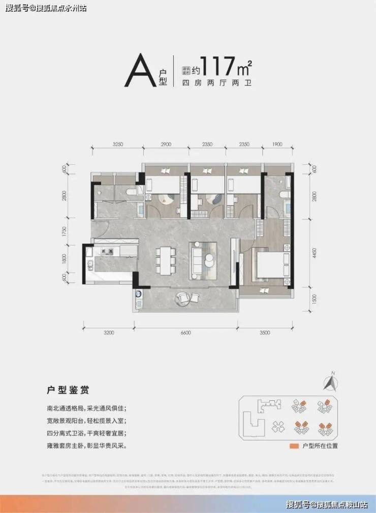 约117㎡四房两卫(3栋1/2单元01/02户型、1栋2单元/2栋02户型)横厅格局,客餐厅开间约6.6米,连通大阳台,主卧开间约3.5米,三个次卧开间分别为约2.9米,约2.35米,约2.35米,基本可以说是约108㎡的放大版,各个功能间面积稍大,最突出的就是厨房和卫生间大很多,其次通透性也相对较好,东南朝向。