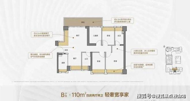 B户型-约110㎡4房2厅2卫:户型分布在1、2单元,竖厅南北通透格局。