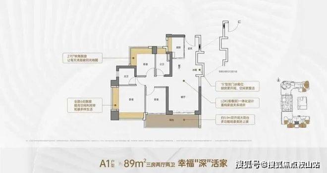 竖厅格局,客厅3.5米开间,LDKB一体化,S墙设计预留冰箱卡槽位,客厅连接次卧出5.9米长的大阳台,主卧双面飘窗,次卧270°转角飘窗,全屋6面飘窗,U型厨房,卫生间干湿分离。