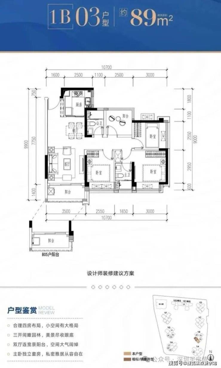 1B-03/05户型:约89㎡ 四房两厅两卫: