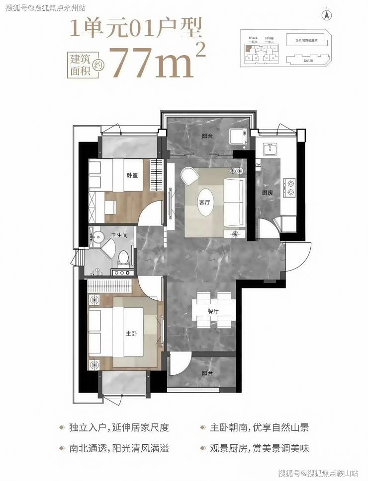 77㎡的2房2厅1卫,1栋1单元01户型,设计的是竖厅南北通透格局,独立入户,客餐厅分离设计,动静分区,南北双阳台,L型厨房,卫生间干湿分离,客厅阳台正北朝向。小户型里面难得可以做到南北通透且有双阳台的格局。