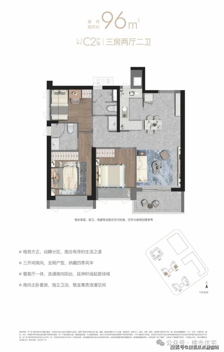 “10.7 m纵深紧凑南向三房”,10.7 m纵深餐客一体,通风采光极佳