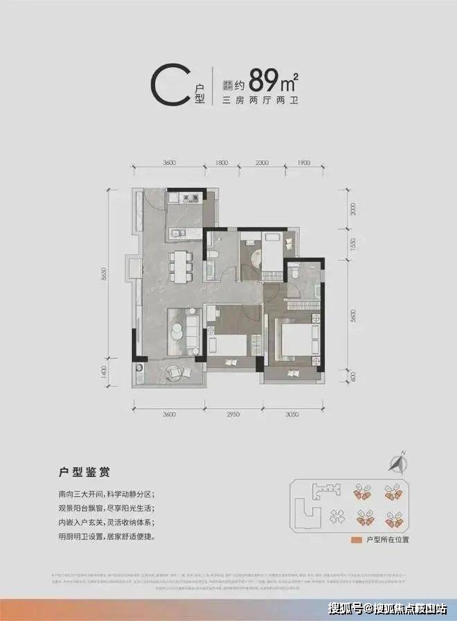 :备案价3.5万/㎡起,折后总价345万起(89㎡三房),均价4.1-5.2万/㎡