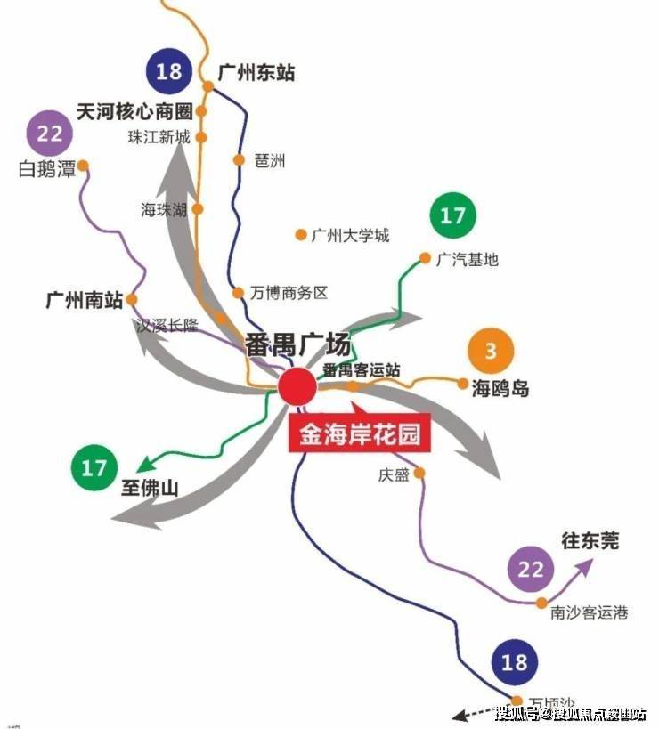 地铁交通方面:紧邻地铁3号线东延段滂江站,一站既达番禺广场TOD,五轨交汇(3号线/3号线东延线/18号线/22号线/17号线)。