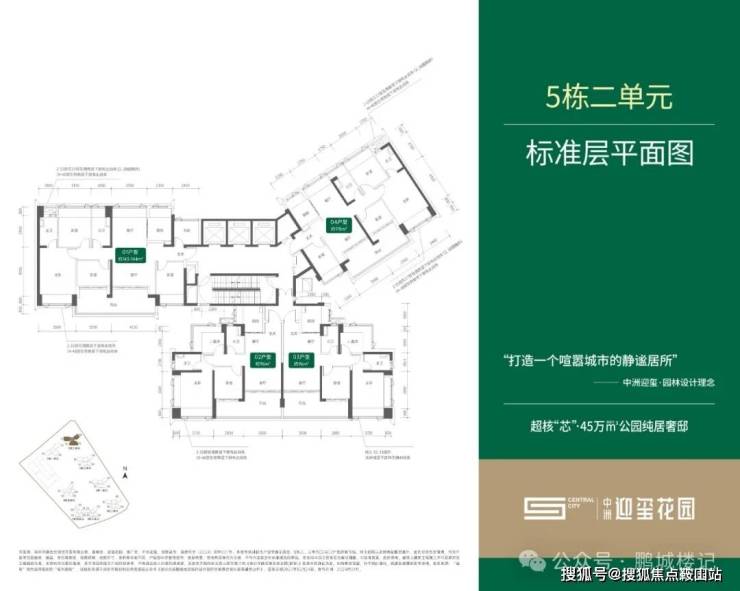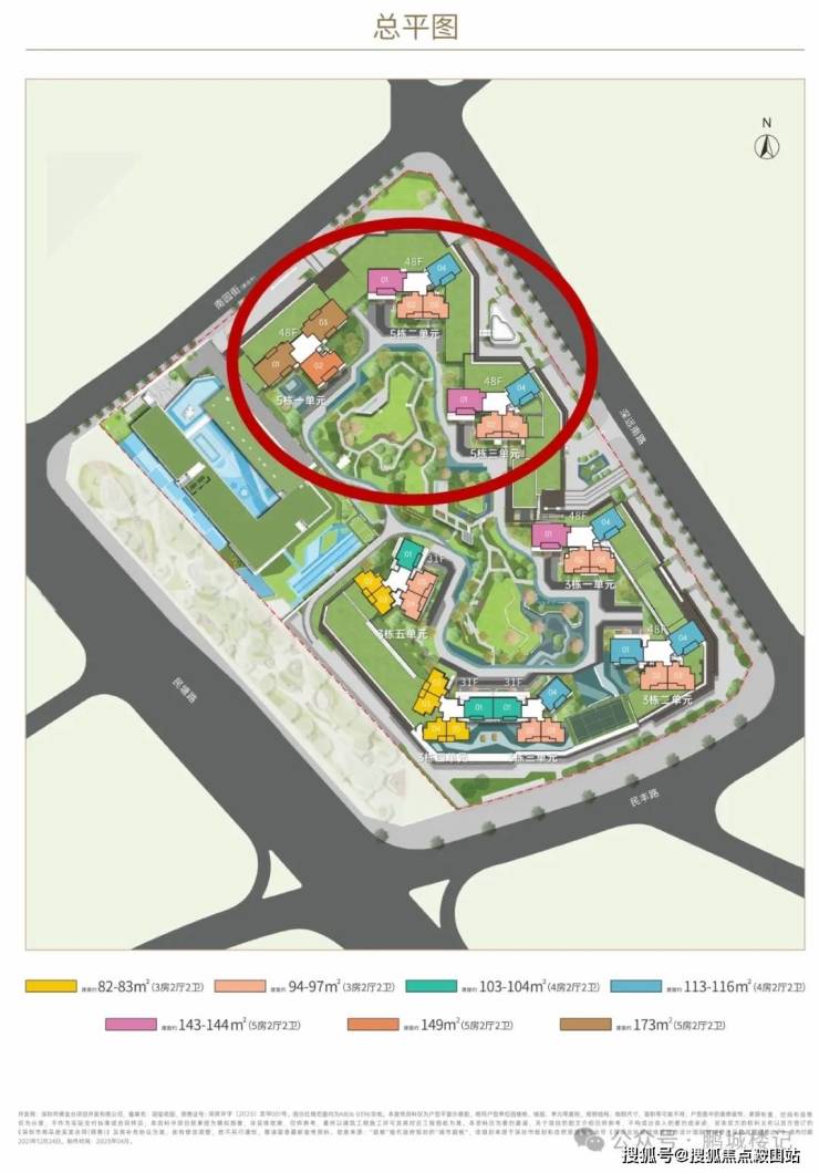 【五栋二、三单元-平面图】,48F,3T4,户型为约96㎡3房2卫(竖厅),180套;约115㎡4房2卫(南北通),90套;约143-144㎡5房2卫(南北通),90套;与三期3栋1单元户型完全一样。01/02/03户型正南向看小区内部花园,视野开阔;04户型东南向,靠近道路外侧,看小区花园。
