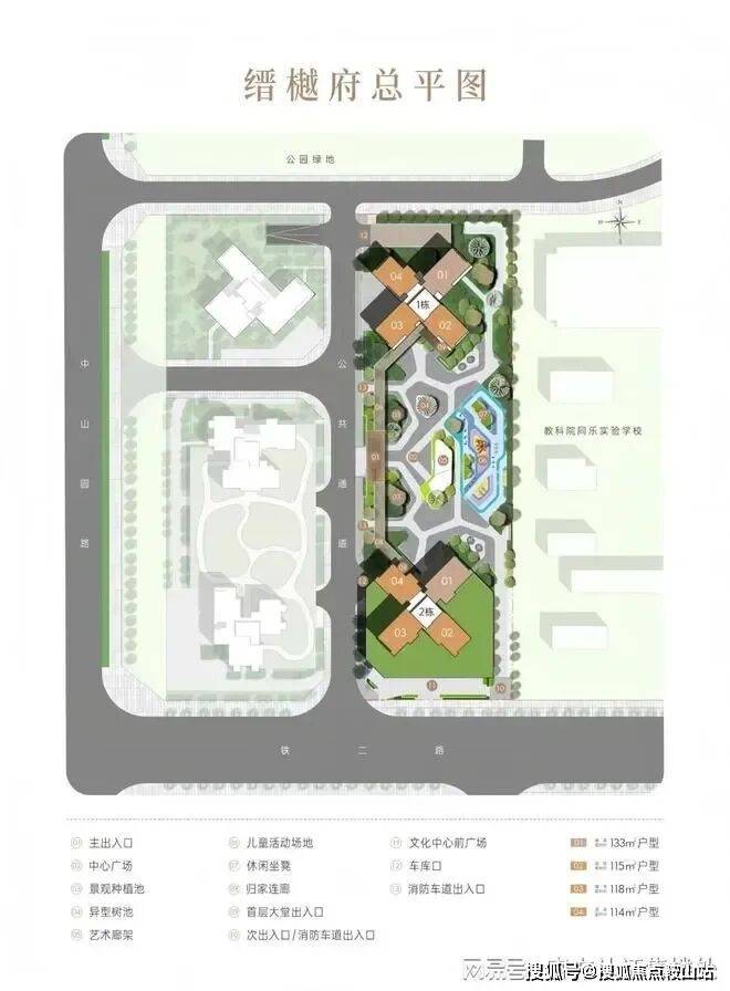 缙樾府总户数为220户,整个项目只有2栋相同平面的100米高纯商品住宅,十字型平面,114-115-118㎡四房各两条腿、133㎡五房2条腿,东南、西南朝向。