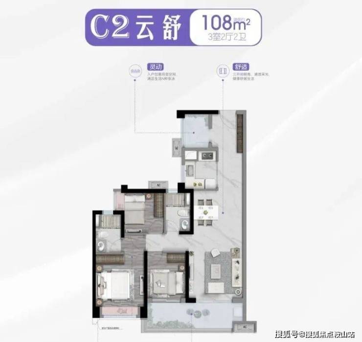 108㎡的 3 + 1 房 2 卫户型,全南向三开间,三卧室朝南,有 6 米南向一字型大阳台和实用的 U 型厨房。135㎡的四房两卫户型,四开间朝南,约 27㎡大方厅南北对流,约 18㎡阔绰主卧带有步入式衣帽间和双飘窗。