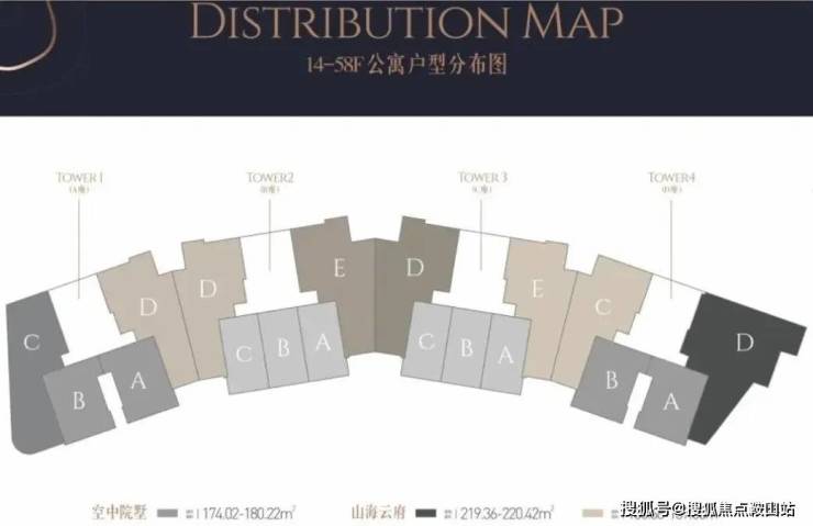 云端居所:14-58层为天际海景公寓,主力户型建面123-220㎡,包含复式院墅与平层大宅,最高使用率突破180%(如130㎡平层实得232㎡);