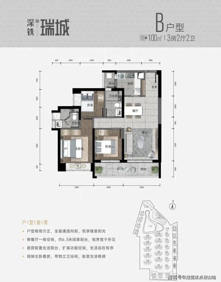 100㎡的3房2厅2卫,A户型,设计的是经典竖厅格局,进门入户玄关,客厅3.5米开间,LDKB一体化设计,动静分区,3个卧室分别做到了主卧12㎡/次卧7.57㎡/次卧6.01㎡(实测面积,去掉墙体),客厅连接次卧出6.3米长的阳台,L型厨房还带1个生活阳台,卫生间干湿分离,得房率约:75.76%(不含赠送),西南或东南朝向。
