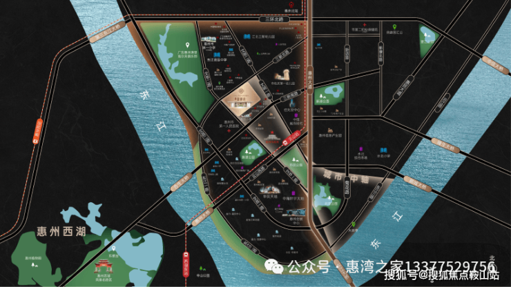 项目于东江之畔,近揽华贸天地、佳兆业广场等大型商业综合体,俯瞰高尔夫球场一碧万顷自然景观,繁华与生态在此完美交融。