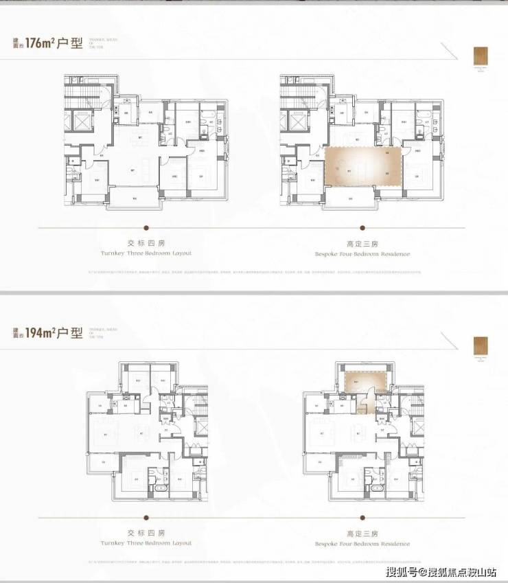 176m²、194m²,三/四房,2梯2户,纯板楼;南北通透与空间舒展。设计大面宽短进深,类似传统顶级平层豪宅的格局,舒适度高;