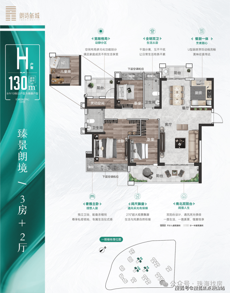 ⑤建面约130㎡四房两厅两卫,南北通透,阔景大阳台,动静分区,全优户型。