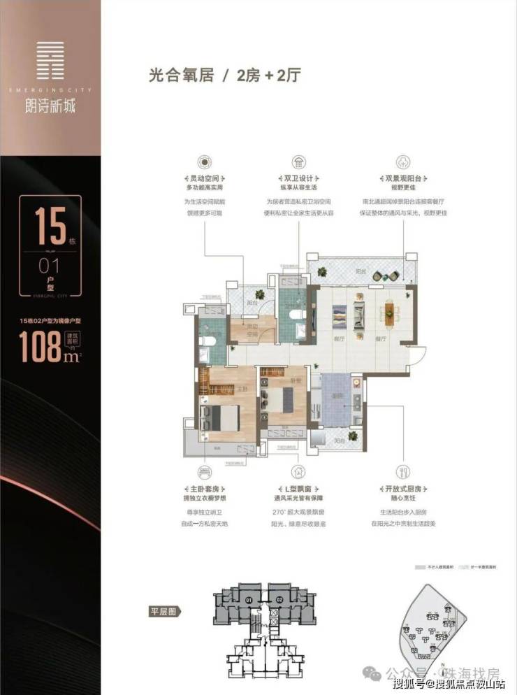 建面约108㎡三房两厅两卫,南北通透,阔景大阳台,动静分区,全优户型。