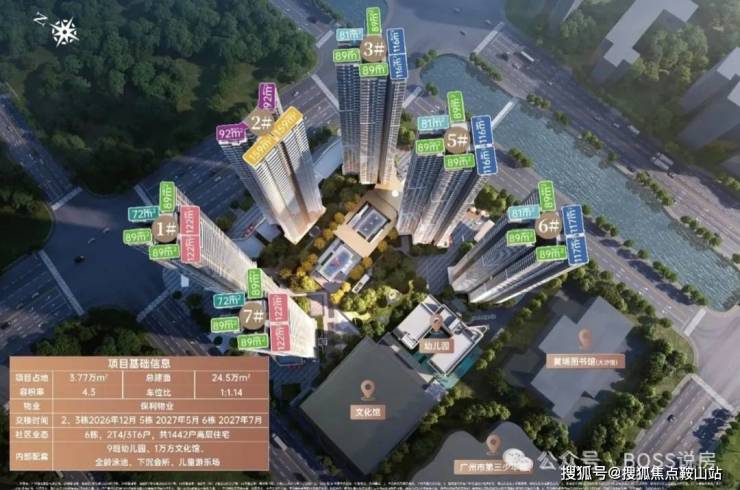 园林景观:项目采用整体围合式布局,东西侧楼栋 45° 错法线排布,通过登高场地外置,内部打造了南北约 100 米 × 东西约 100 米的纯粹大尺度中心花园,营造出宽敞的绿化空间和良好的居住环境。