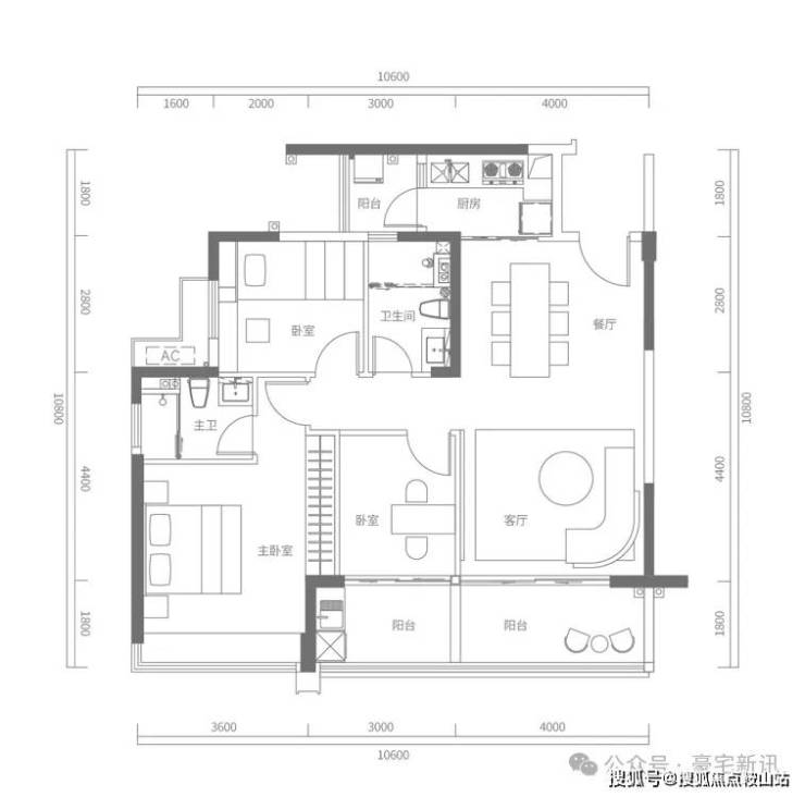 C户型建面约120㎡,3+1房2厅2卫