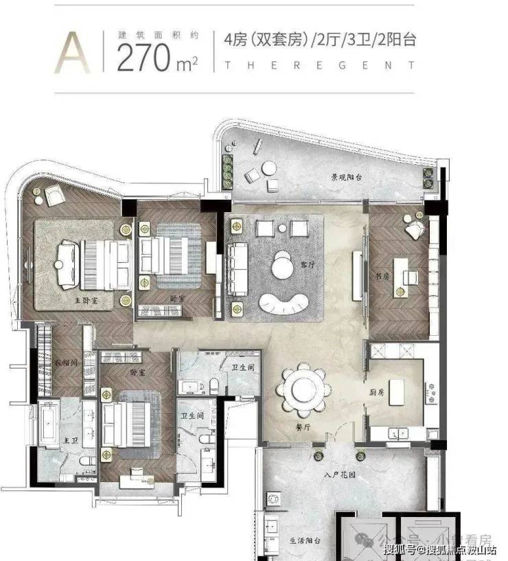 建面约270㎡:4房(双套房)2厅3卫2阳台独立电梯入户奢享专属归家礼遇多功能入户花园,定制仪式感空间双主套房设计,约6米超阔客厅开间270°环幕江景视野,自然身心共鸣