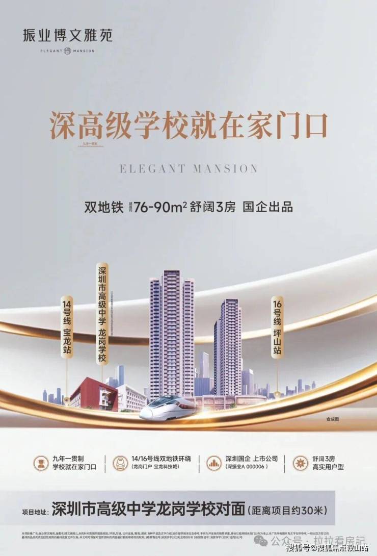 小区位于深圳市高级中学龙岗学校对面,宝龙科技城 · 东部高铁新城双城交汇,由国企振业集团开发,建面约76-90㎡舒阔3房 准现房 。其中76平三房两厅一卫折后总价约227万~247万;90平三房两厅两卫折后约292万~307万。