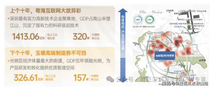 【光明产业最强街】下一个粤海街道南有粤海,北有玉塘:玉塘位于光明区的最南面,离南山地缘最近,面积占光明区的13%,聚集了光明1/3的产业产研结合奠定了粤海街道的成功,玉塘现已汇聚168个科研实验室,20余支院士团队,科研院所人才4400人。通过深圳最强科创中轴线的链接,将加速两地产业、人才的互联互通