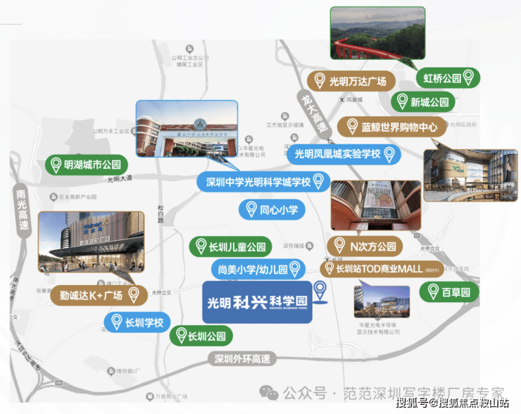 【生产生活配套成熟兑现】职住平衡,人才无忧四大醇熟商圈:N次方公园、蓝鲸世界、万达广场、勤诚达K+广场四大商圈,超20万㎡成熟商业提供活力、趣味、年轻化的生活圈六大公园环绕:长圳儿童公园、百草园、长圳公园、新城公园、虹桥公园、明湖城市公园6大公园簇拥,体验花园式生产办公教育/居住配套:配建6万㎡精装居所,400米内两大保障房小区提供超1万套租赁房源。项目西侧毗邻尚美小学,2公里内覆盖深圳中学光明科学城学校、光明凤凰城实验学校、长圳学校、同心小学等多所优质学校