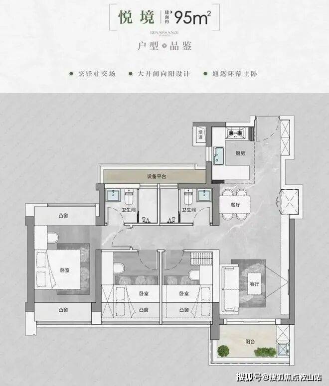 95㎡的3房2厅2卫,设计的是经典竖厅格局,进门入户玄关,LDKB一体化,S墙设计预留冰箱卡槽位,四开间朝南,U型厨房,卫生间干湿分离,还带1个超大设备平台,得房率约95.47%(包含赠送),东北朝向。