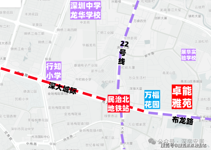 卓能雅苑,位于龙华区民治街道布龙路与油松路交界处,项目西侧是新房万福花园,北侧是嘉龙山庄,南侧是布龙路,周边居住氛围、商业氛围都特别浓厚,深大城际和22号线换乘站“民治北站”距离约500米。