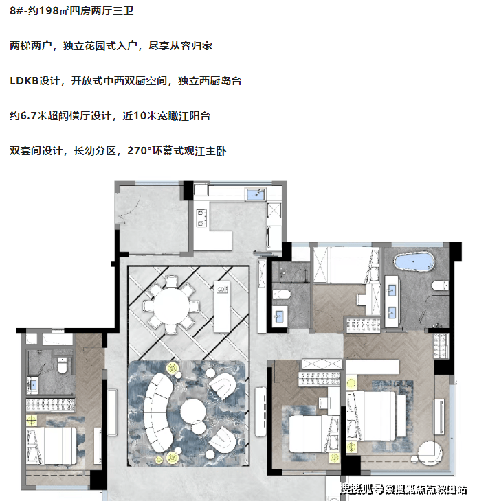 江瓒公馆提供的户型种类繁多,既有适合小家庭的小户型,也有满足大家庭需求的大户型。每个户型都经过精心设计,力求在有限的空间内创造出最大的使用价值。特别是部分户型采用了开放式布局,增加了室内的通透感和宽敞度。例如,119㎡的三房两厅两卫户型,拥有独立花园式入户和LDKB设计,营造出一种既实用又从容的生活氛围。而198㎡的四房两厅三卫户型,则配备了两梯两户设计,以及近10米宽的瞰江阳台,尽显奢华与大气。