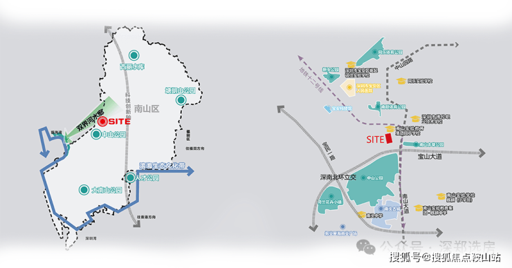 位于深圳南山区中部组团,属于粤港澳大湾区第一发展圈层,是高新技术、文化创意、文脉传承于一体的创新发展片区。场地区域位置优越,周边配套丰富,2KM 范围内有公园、学校、南头古城商圈、医院、地铁等;场地高层视线开阔,可远眺深圳湾。