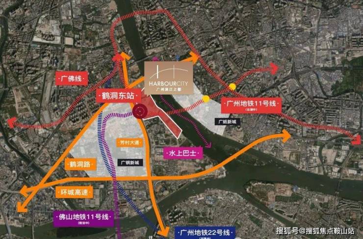 广州11号线鹤洞东站地铁上盖,拥有3横2纵大路网+公交站场+水上巴士,集水、陆、轨等多维交通方式于一体,半小时城央生活圈,1小时湾区生活圈。